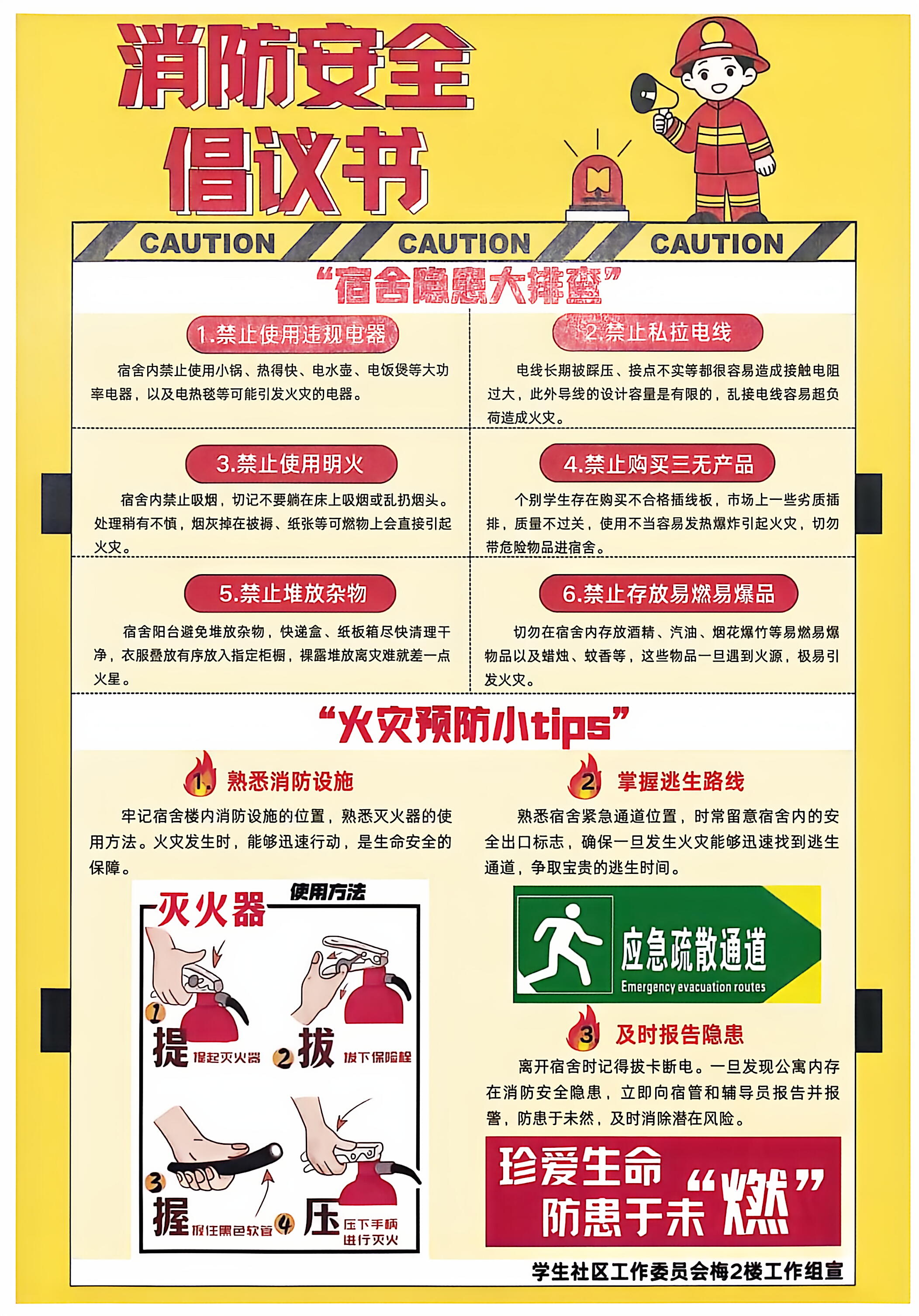 为全面提升学生消防安全意识,普及防火自救知识,2025年12月3日,学生社区工作委员会梅2楼工作组于各宿舍区组织开展了消防安全宣传教育活动。