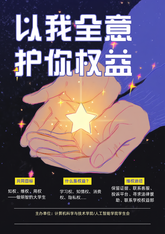 为切实增强大学生维权意识与自我保护能力,营造校园权益文化氛围,我院学生会于2025年9月25日至10月8日组织开展了“以我全意,护你权益”主题海报设计活动。活动面向计算机科学与技术学院/人工智能学院全体学生,鼓励同学们通过创意设计普及权益知识,提升依法维权能力。