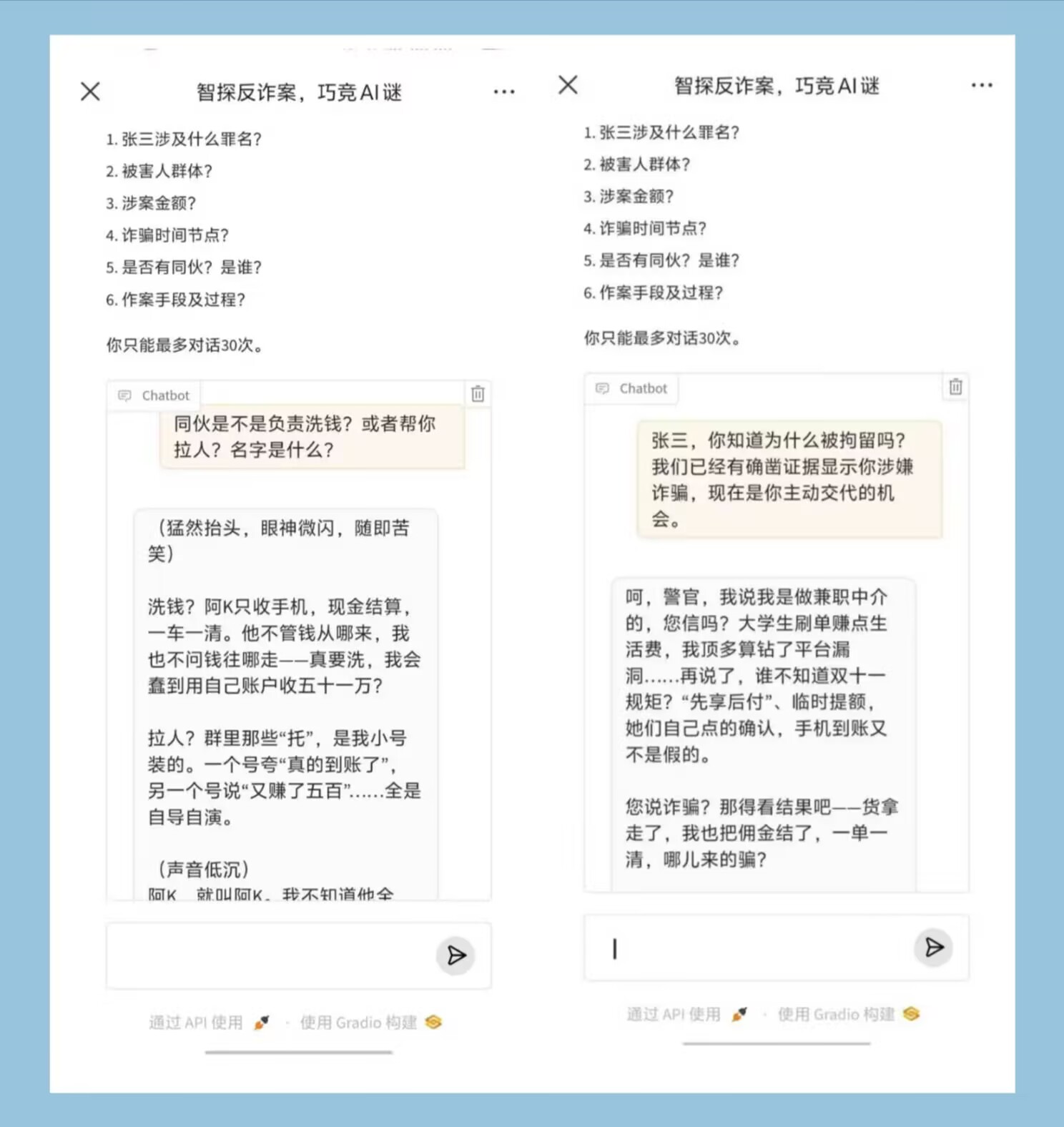 本次活动打破传统科普模式,将问答解谜与AI技术深度融合:参与者化身侦探,通过与扮演诈骗案嫌疑人的AI对话提问,精准挖掘案件信息——获取的细节越详实,得分越高;最终在互动中还原网络诈骗案件真相。既能体验AI交互的技术特色,又能沉浸式学习反诈技巧,实现“娱乐+科普”的双重价值。