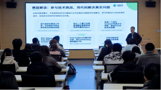 负责人为在场学生详细解读了比赛相关内容。比赛聚焦AI编程领域,鼓励参赛者基于CoStrict工具开发实用AI应用、攻克技术难题,旨在“以赛促学、以学促创”,培养兼具AI能力与实践力的复合型人才。