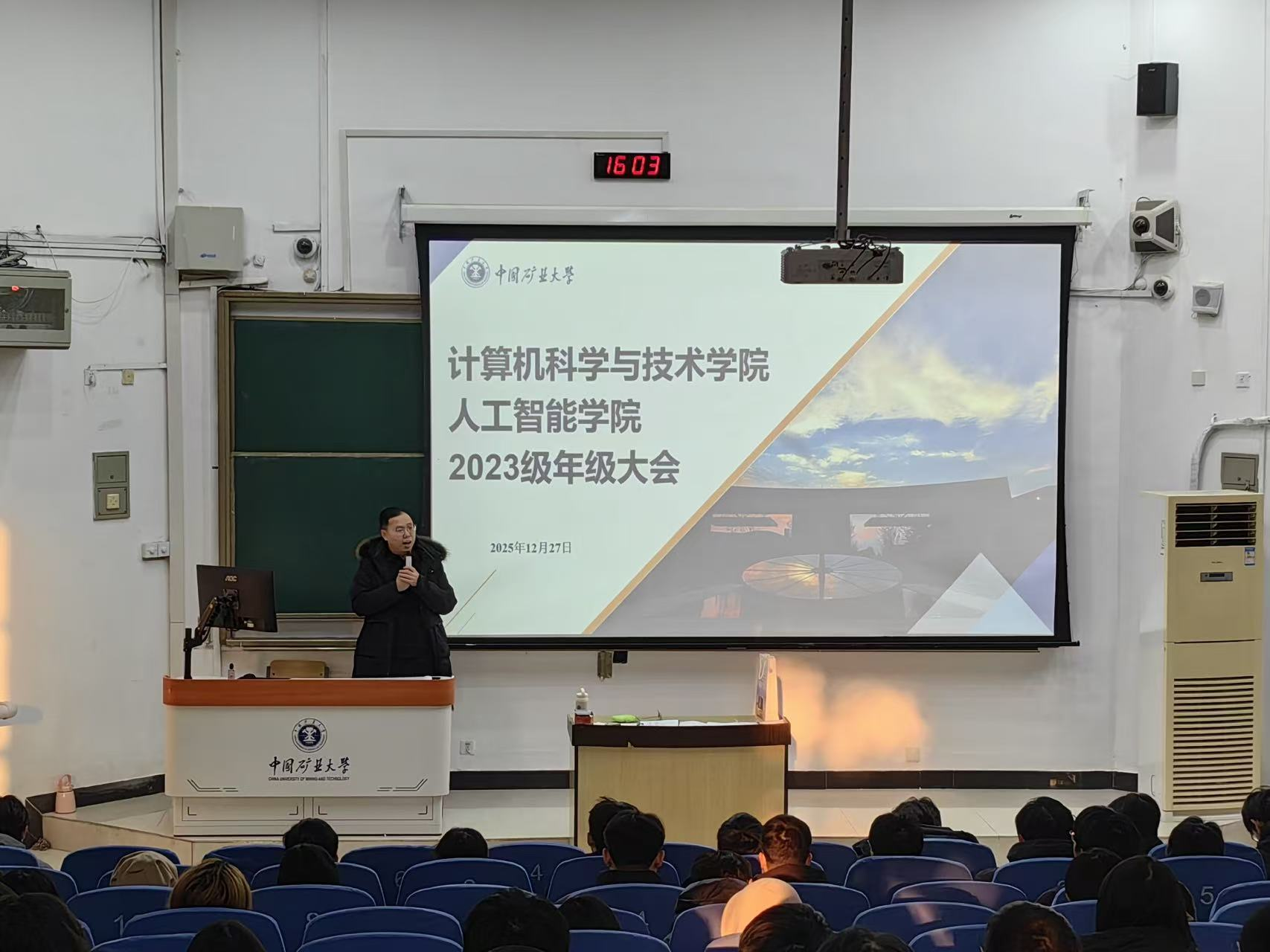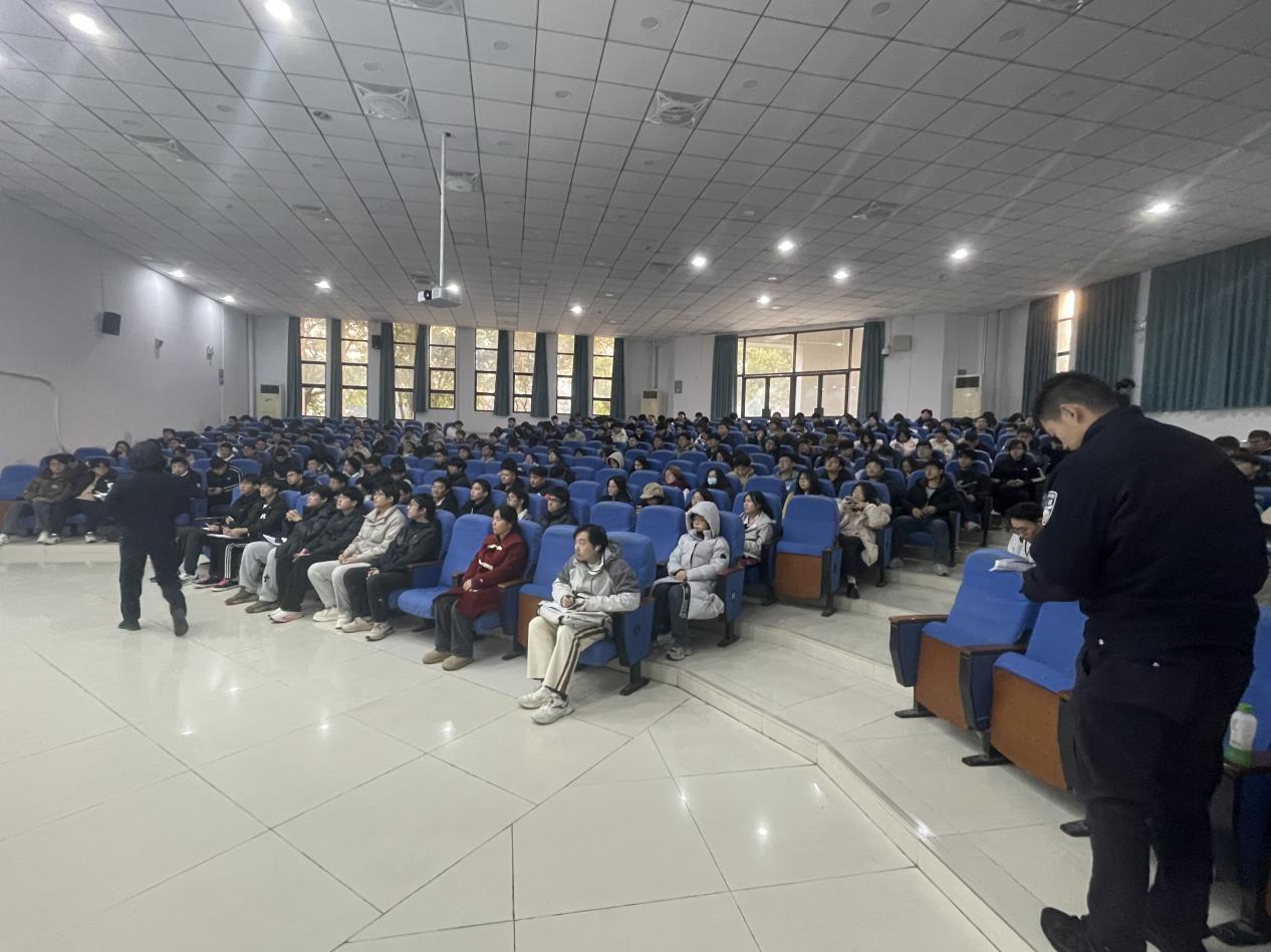 为进一步提升学生安全防范意识、严肃考试纪律、引导学生合理规划假期安排,2025年12月27日,我院2023级本科生于博2C102教室召开“反诈安全教育暨年级大会”。会议就期末学风建设、寒假相关安排及防范电信网络诈骗宣传等工作进行了部署与强调。本次会议由专职辅导员韩松鹤老师主持,特邀徐州市公安局刑侦支队警官到场作反诈专题宣讲。兼职辅导员苏彬及2023级全体学生共同参会。