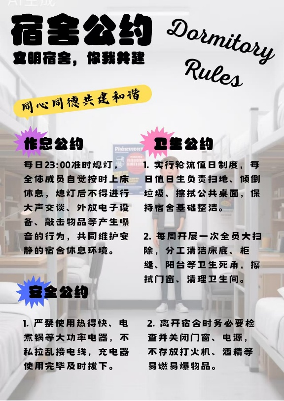 为营造和谐有序的宿舍环境,引导学生共建共享文明居所,我院于2025年12月15日至28日组织开展了“和谐宿舍,你我有约”宿舍公约征集活动。