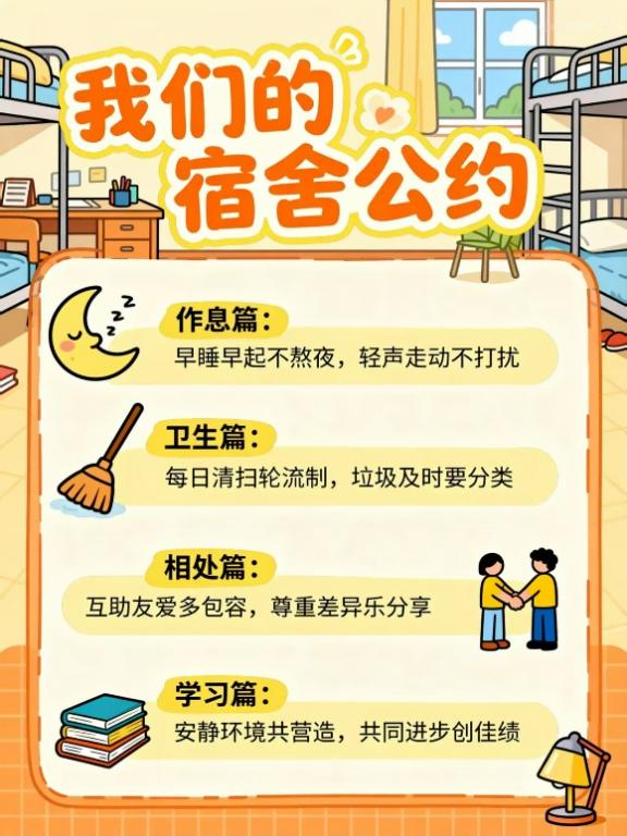本次活动有效促进了室友之间的深入交流与协作。同学们设计的公约形式多样、内容务实,充分展现了智慧与自律意识。活动不仅广泛征集了同学们对宿舍管理的建设性意见,形成了具有操作性的行为规范,更进一步推动了整洁、文明、团结、互助的宿舍文化建设,为学生的健康成长与学习生活奠定了良好基础。