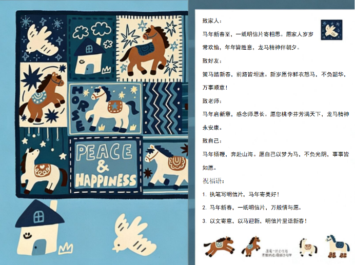 本次活动面向全院学生,得到了同学们的积极响应与热情参与。大家利用课后、晚自习等时间专注构思,将真挚情谊落笔成文。同学们结合即将到来的马年主题,在明信片上写下对家人的牵挂、对朋友的问候、对师长的感谢,也寄托了对新一年的期盼与对成长的展望。不少同学还精心绘以骏马、祥云等传统图案,让每一张明信片都文图并茂、诚意满满,既体现了传统文化的韵味,也展现了同学们的巧思与才情。
