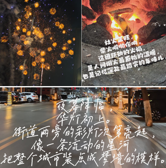 同学们纷纷化身“年味记录者”,用镜头对准身边的春节氛围,以特写捕捉细节中的年味,以乡音传递真挚的乡情。在为期两周的活动中,大家热情投入,定格下一幕幕动人的家乡瞬间:市井集市的热闹喧嚣,夜空中璀璨绽放的烟花,屋檐下家人围坐共享年夜饭的温馨场景……镜头前,不少同学还邀请长辈一同出镜,用地道方言道出“新年快乐”与专属祝福。一段段短视频虽不长,却浓缩着对新年的美好期许和对团圆的由衷喜悦。大家在创作中交流灵感、分享温暖,共同营造了浓厚的节日氛围。